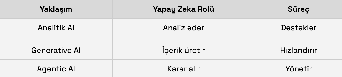 Bugün gelinen noktada ise bu dönüşüm bir adım daha ileri taşınıyor. Agentic AI, Agent Framework yaklaşımlarıyla birlikte yapay zeka, yalnızca belirli görevleri yerine getiren bir teknoloji olmaktan çıkarak süreçleri yöneten, karar akışlarını şekillendiren, operasyonun aktif bir bileşeni haline geliyor. Bu dönüşümü daha net görmek için yapay zekanın sigortacılıktaki rolündeki değişime bakmak yeterli: Analitik AI veriyi analiz eder ve karar süreçlerini destekler. Generative AI içerik üretir ve süreçleri hızlandırır. Agentic AI ise karar alır, aksiyon başlatır ve süreci yönetir.