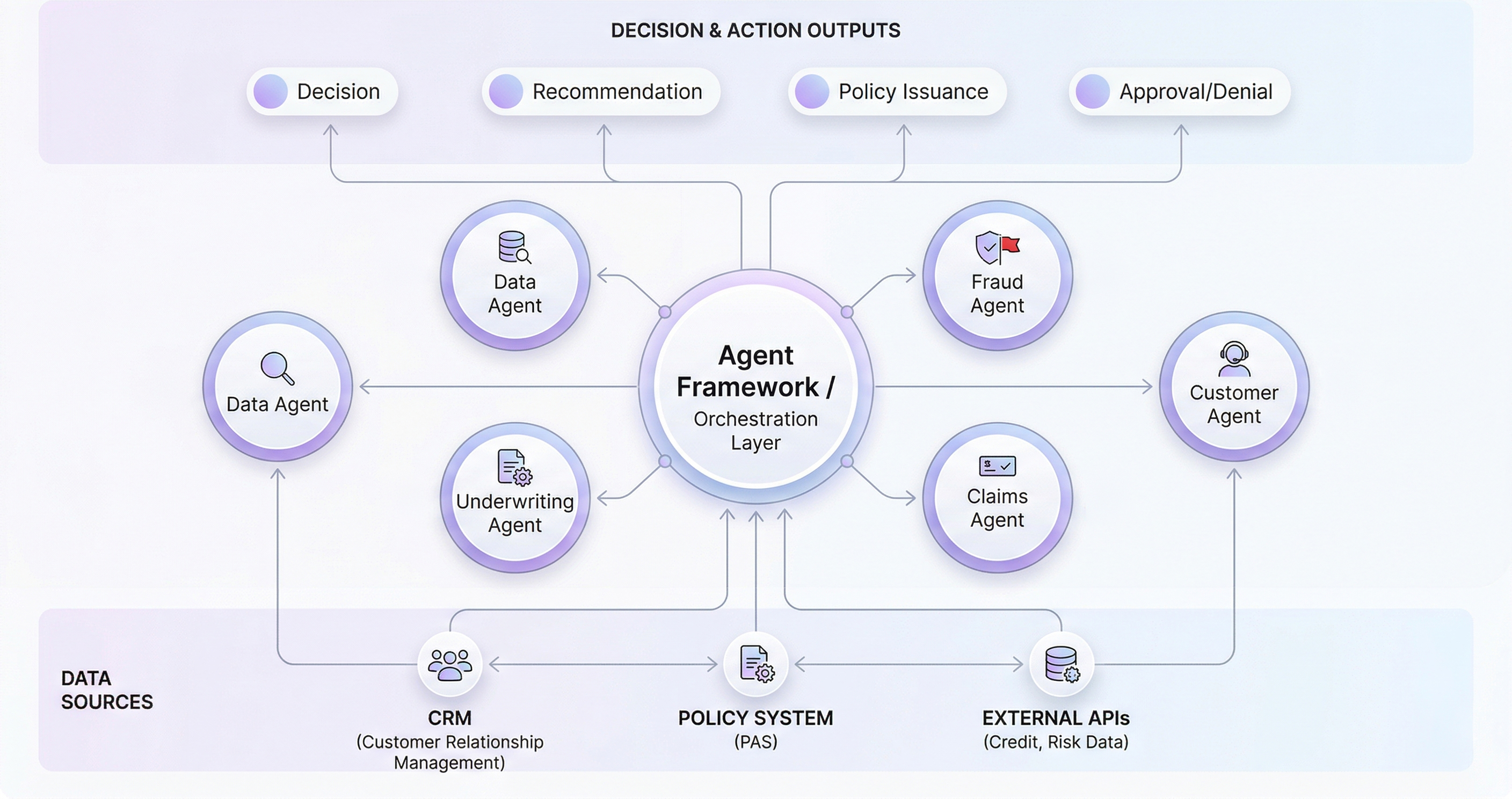Agent Framework, farklı görevleri üstlenen dijital agent’ların aynı süreç içinde koordineli biçimde çalışmasını sağlayan bir mimariyi ifade eder. Bu yapı, sigortacılıkta alışık olunan lineer süreçleri, birbirine bağlı ve birlikte çalışan karar katmanlarına dönüştürür.